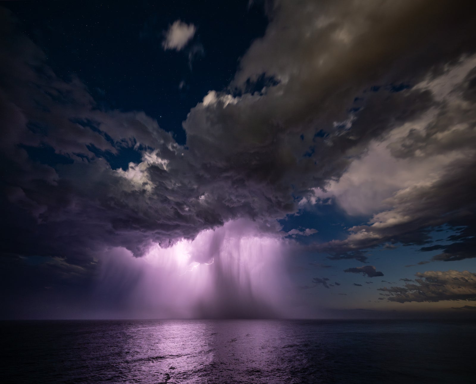 Lightning Flashes... Lightning illuminates the the Pacific Ocean under starry skies.